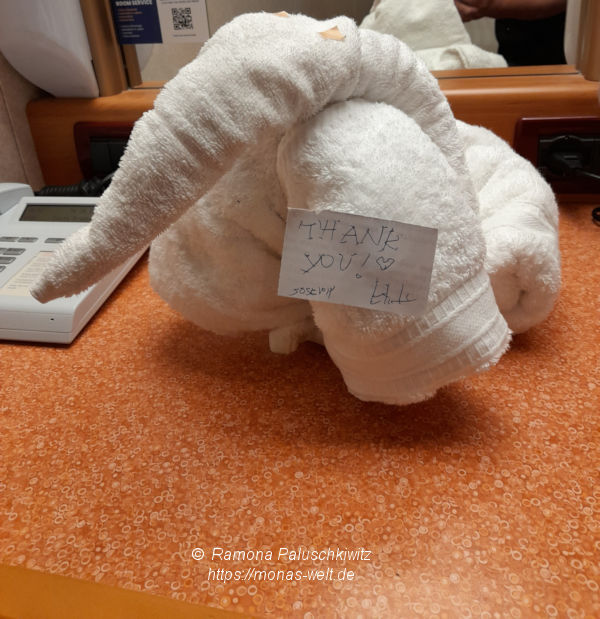 Ein Handtuch-Elefant von Joseph der für unsere Kabine für die Reinigung zuständig war. Auch ein ganz lieber Mensch, wie irgendwie alle Mitarbeiter an Bord 🙂