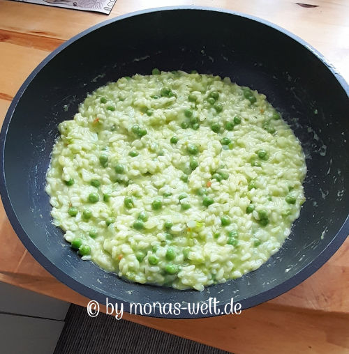 Zum Schmuss die restlichen Erbsen in das Risotto geben , nochmal alles
