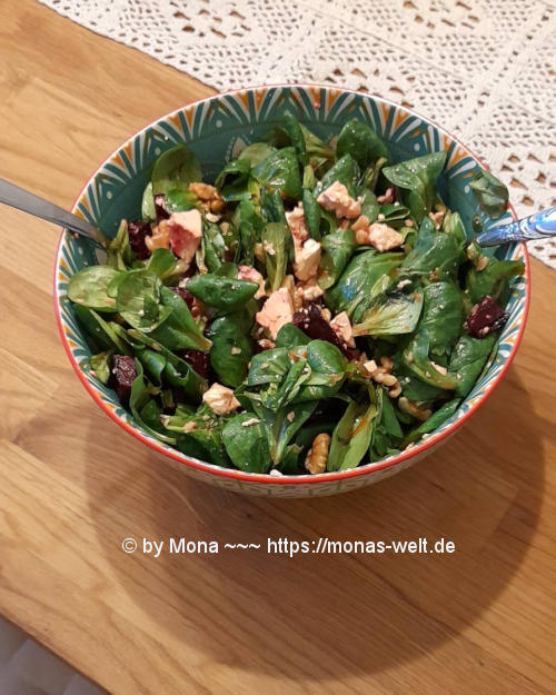 Für das Dressing alle Zutaten zusammen rühren und über den Salat geben.
